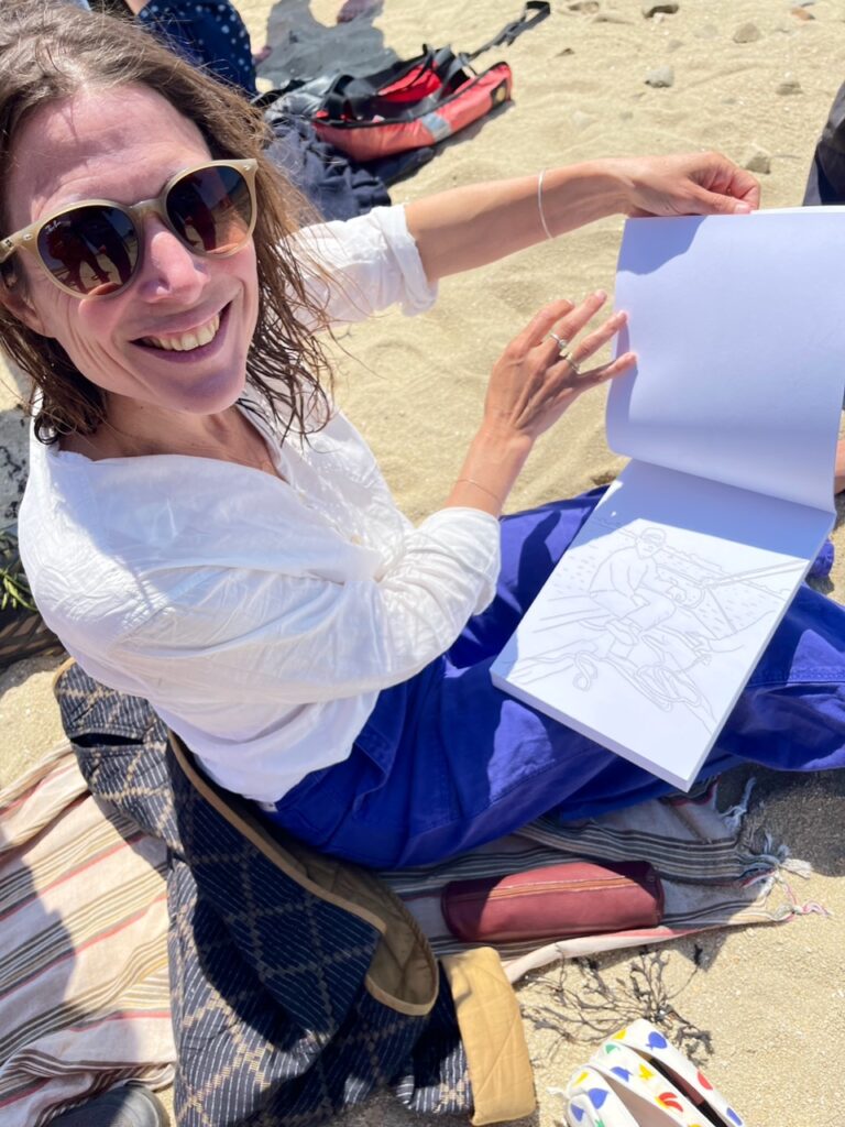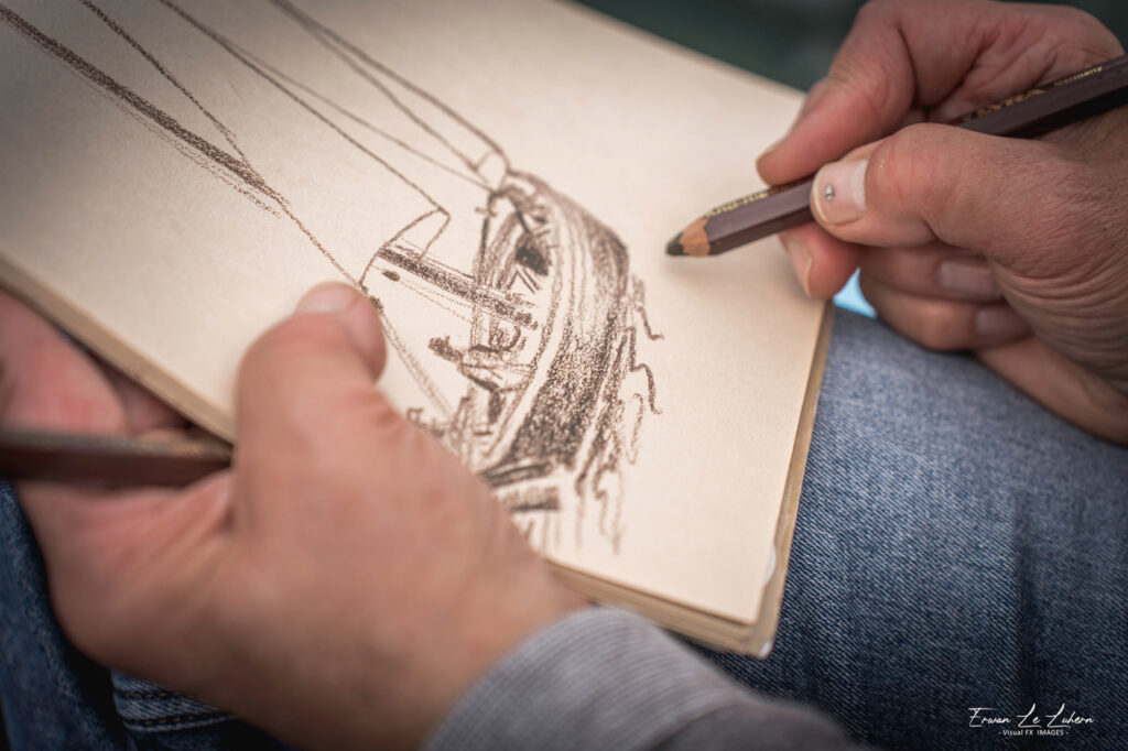 Le 26 mai 2023, carnet et crayons en main, elle n’a quitté son carnet que pour la pause déjeuner et une baignade à l’île d’Ilur. Pour elle, dessiner à bord c’est capturer l’essence du temps qui passe.